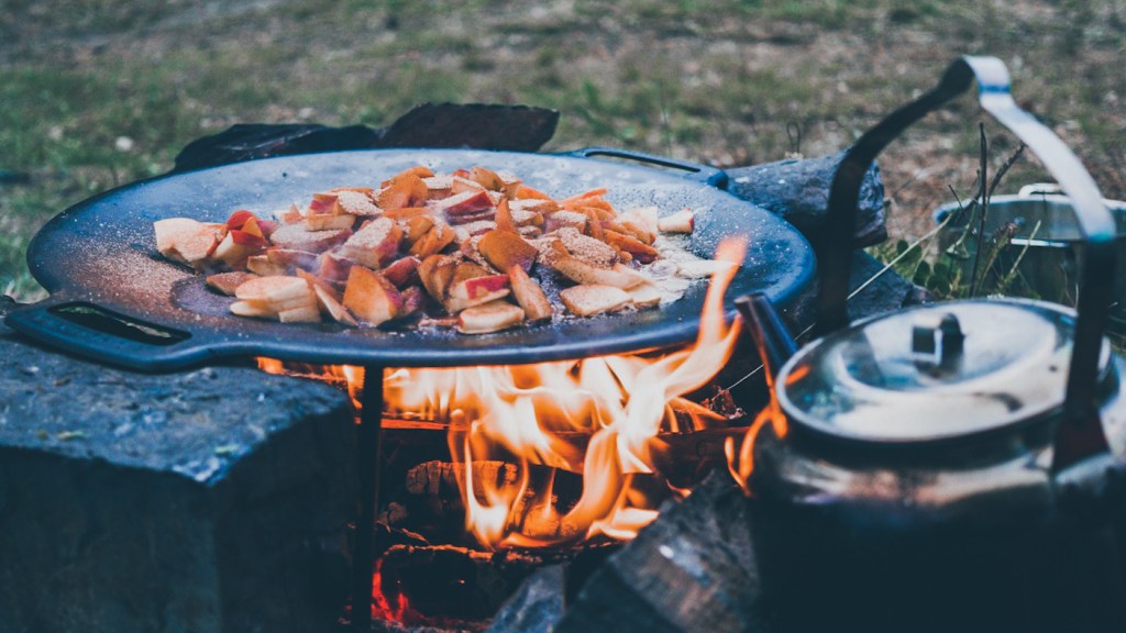 - När äpplena blivit lite mjuka så kör du på socker/kanelblandningen. Rör om noga och lägg på några pinnar i elden för nu ska värmen upp.