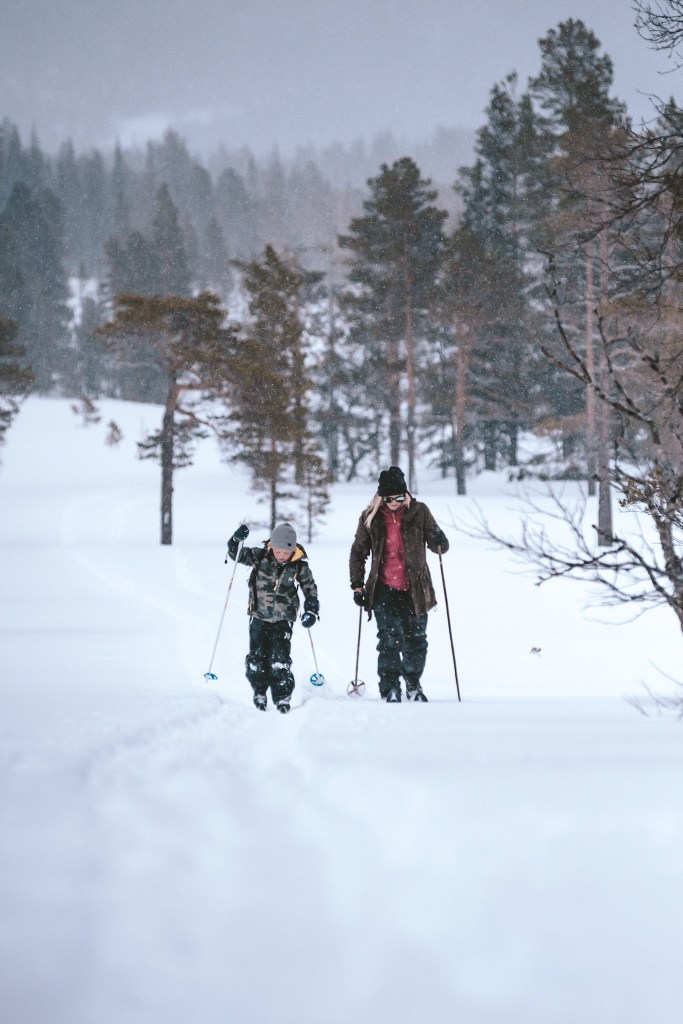 Jag är uppvuxen i de fjällen men vi har alltid åkt skoter överallt och skoter blir lätt meckigt. Först ska man ha en, sen ska den förmodligen transporteras dit på en släpvagn och det ska tankas och fixas. Turskidorna är lättare och jag tänker att allt som är lättare öppnar upp för att det faktiskt blir av! Så ta en tur på turskidor med familjen, hyr grejor om du inte har och packa ryggsäcken full med fika, glöm bara inte den obligatoriska chokladkakan för chokladpauser är mer obligatoriskt än skidorna själva när det ska turas med barn!