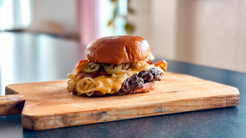 Jag älskar burgare, skulle kunna äta det varje dag och den gången vi bilade runt i Kalifornien i två veckor var det precis det jag gjorde. Till frukost lunch eller middag. Jag har alltså ätit min beskärda del burgare och jag har lagat ett antal, den ena krångligare än den andra. Visst, det är många som säger att de har receptet på den bästa burgaren, det är högrevsfärs hit och silverlök dit, egenbakat bröd och 25% fetthalt. Och det blir bra. Men det är tjorvigt och tjorvigt blir sällan av. Därför får du det här receptet. Se det som en bas. Om du vill kasta på vindelnrökt bacon, picklad rödlök, romansallad eller nån knepig mögelostkräm så gör det! Men du behöver inte för den här burgaren är vansinnigt god precis som den är.