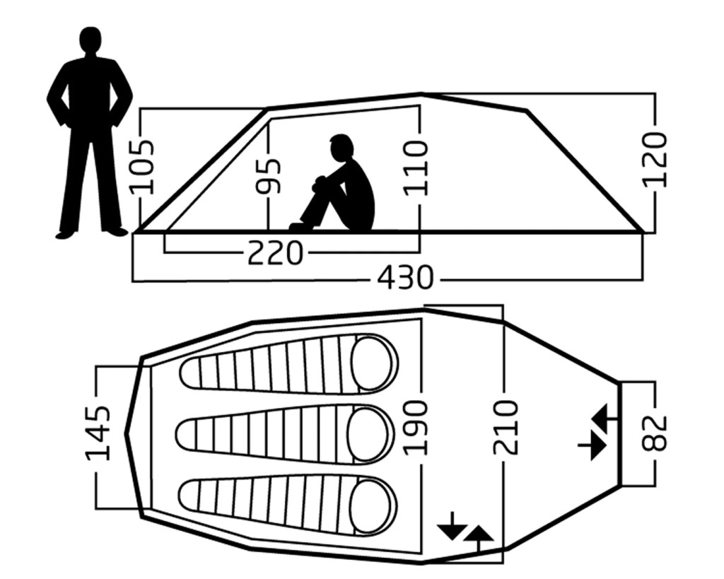Seiland 3 är ett tunneltält med en väl tilltagen absid och total storlek, det som slog mig när jag först läste specen är storleken. Som du kanske själv stött på är antalet personer, i det här fallet 3, ofta en glädjesiffra och med dagens användning av uppblåsbara liggunderlag som inte går att placera omlott visar det sig ofta att du kan dra av en person från det kommunicerade antalet som ska rymmas i tältet. Men inte med det här. Med en bredd på 190cm i huvudänden och en avsmalnande profil som slutar med 145cm i fotänden går det faktiskt att få in tre stycken normalbreda liggunderlag i bredd. Det, i kombination med höjden på 110cm, gör det här tältet rymligt i jämförelse med liknande tält. Min rekommendation är dock att bo två personer eftersom du då har utrymme för kläder, annan packning och eventuellt en hund eller två. Allt utan att en klaustrofobisk känsla infinner sig.