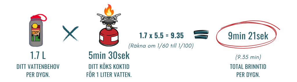 Multiplicera ditt vattenbehov med koktiden för 1 liter vatten. För att förenkla ekvationen behöver du omvandla 1/60 till 1/100 vilket ger siffrorna 1.7l x 5.5min = 9.35min (9min 21sek). Det du nu fått fram är den totala tid du behöver köra din brännare per dygn.