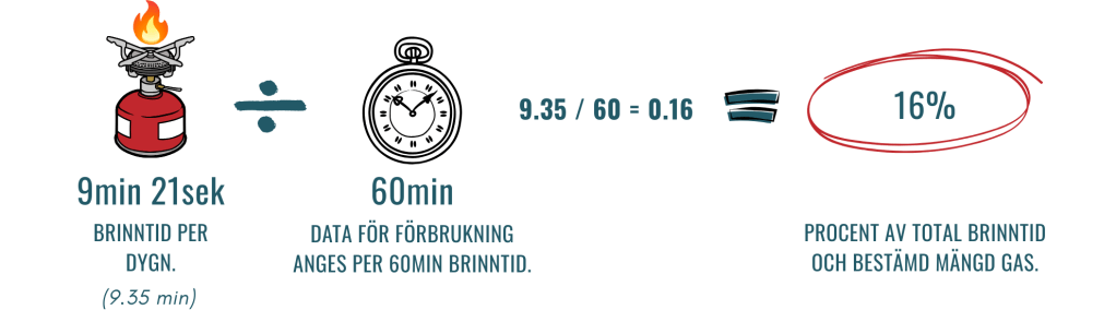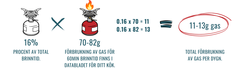 För att kunna räkna ut din dygnsförbrukning ska vi nu multiplicera procenten med den angivna förbrukningen från databladet. För det Primus Lite+ som jag använder i exemplet var det alltså mellan 70-82g gas/h drifttid vilket ger oss talen: 0.16 x 70 = 11 samt 0.16 x 82 = 13. Nu har du fått fram din totala dygnsförbrukning av gas.